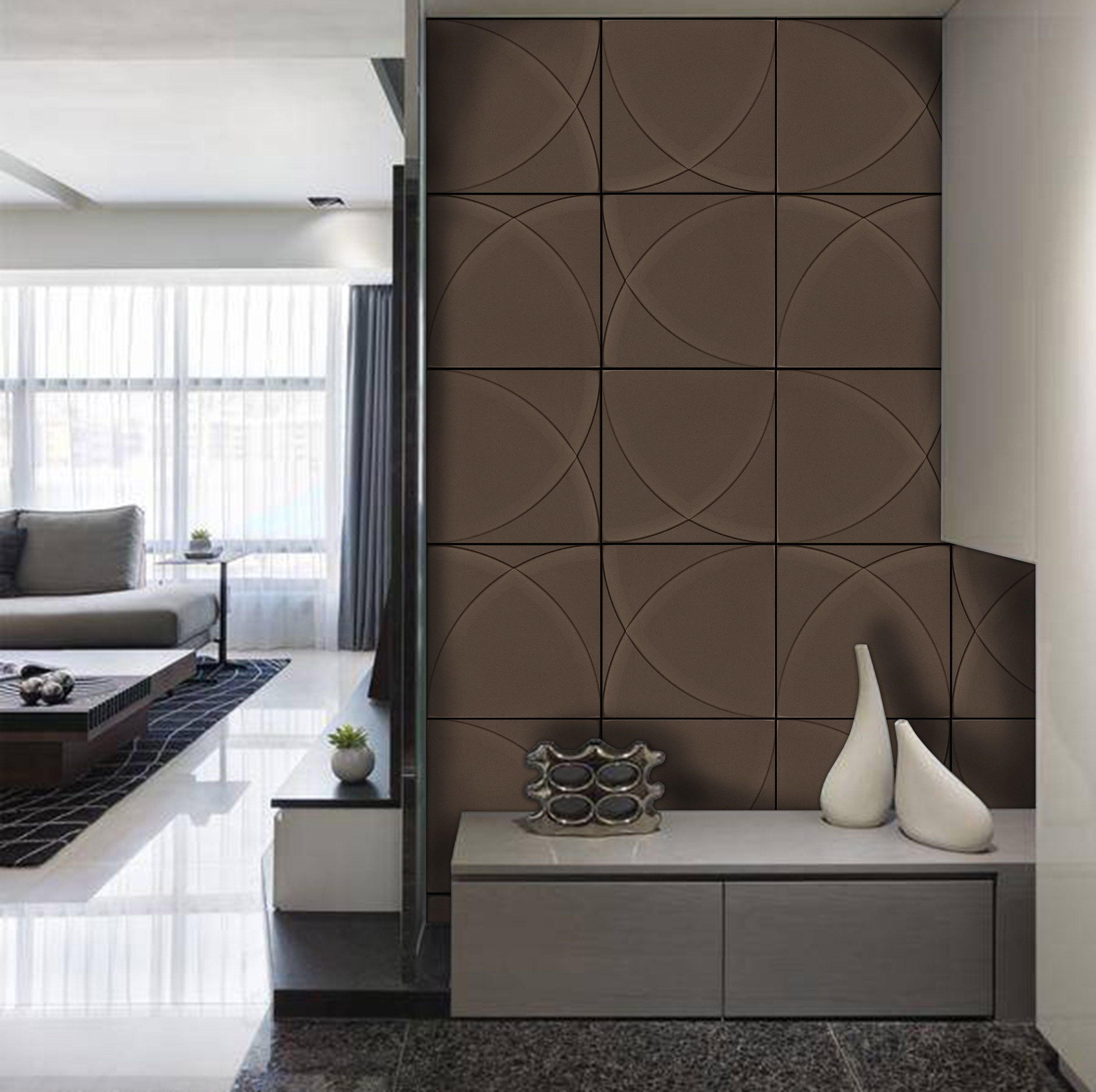 可設計在居家或是公共空間壁面,玄關,天花板,櫃體,傢俱等……..任何想裝飾的地方都可以使用,讓居家生活輕鬆獲得全新裝飾藝術,安裝只需使用皮革磚專用環保結構雙面膠,遇邊角尺寸不合可直接使用美工刀裁切。